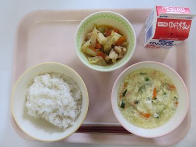 麦ごはん ニラ玉スープ タッカルビ 牛乳