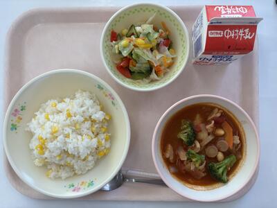 コーンバターライス 鶏肉のトマト煮 チョップドサラダ 牛乳
