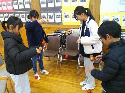 12月2日(火)場所を祇園テラス鞍楽(くらら・旧鞍岡中学校)に移動してのクラブ活動は、本年度2回目です。今回は、地域の皆さんと一緒にボッチャをしました。その後、けん玉やお手玉、コマなどを使って昔の遊びを体験しました。