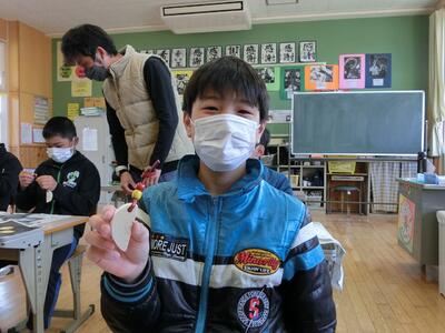 五ヶ瀬町林業研究グループ連絡協議会の方から、キーホルダーの仕上げ方を教えていただき、6年生は自分の分を紙やすりで削ったり、革紐を通したりして仕上げました。友達と合わせると一つになる、とても香りのいいヒノキのキーホルダーが出来上がり、みんなとても満足していました。