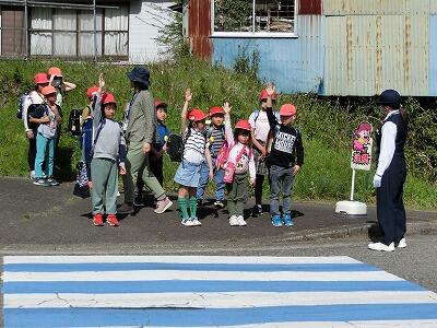 運動場で安全な横断歩道の渡り方、歩行練習をした後は、集団下校をして、実際の道路でしっかりできるか確かめました。みんな、手をしっかりと挙げて、「右よし、左よし、横断よし」と大きな声を出しながら安全確認を行うことができました。