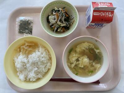 麦ごはん 鶏飯の汁 漬物 一食きざみのり 千草和え 牛乳
