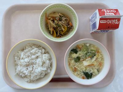 麦ごはん 中華コーンスープ チンジャオロース 牛乳