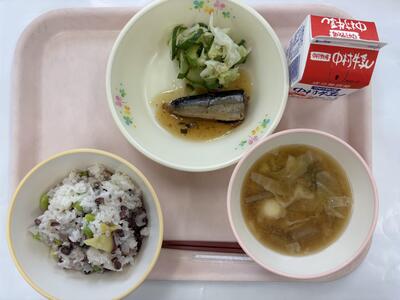 萩ごはん 月菜汁 さんまの甘露煮 即席漬け お月見団子 牛乳