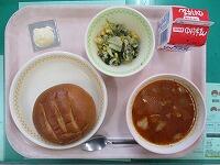 米粉パン 牛乳 ポークビーンズ チーズ ほうれん草とコーンのサラダ チーズ