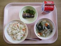 たけのこごはん 牛乳 いわしの甘露煮 きゅうりもみ 根菜のごま汁