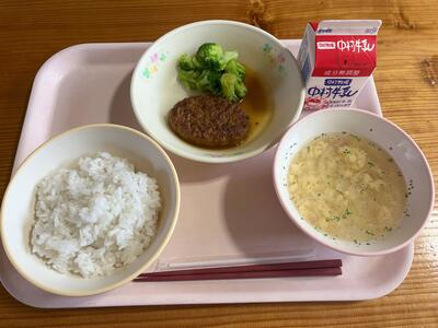 麦ごはん ふわふわスープ 煮込みハンバーグ ブロッコリー 牛乳