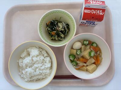 麦ごはん 鶏肉と里芋のみそ煮 まだか漬け 牛乳