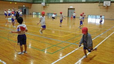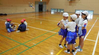 体育館での体育。1年生は、なわとび遊び。はじめの頃よりとべるようになりました。4年生は、タグラグビーの導入のゲーム。しっかり作戦会議をして得点をねらいます。