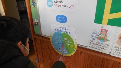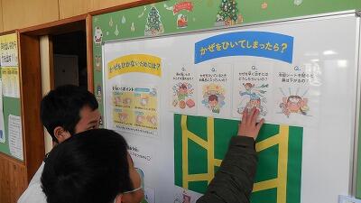 保健室廊下の掲示板には、かぜについて掲示されています。かぜをひかないための手洗いのポイントが分かります。かぜをひいたらどうしたらよいか迷路で答えが分かります。ふだんの生活をみなおす、よい機会です。