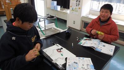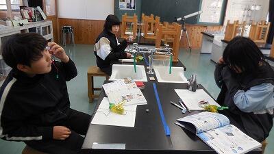 6年生の理科は、発電と電気の利用の学習をしています。手回し発電機でコンデンサーに電気をたくわえ、オルゴールを鳴らす実験をしました。豆電球や発光ダイオードも試して、同じ電気の量でも必要な電気の量が異なることにも気付かせます。