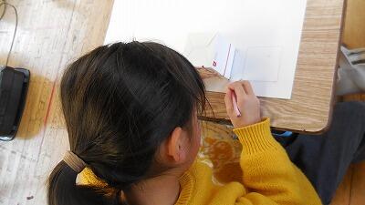 2年生は、算数で家から持ってきた箱の面を画用紙にうるし、箱をつくる活動に取り組みました。どんな箱ができるでしょうか。組み立てながら、2つの合同な長方形が3組必要なこと等に気付いていきます。長方形を正確に写し取れていなかったり、画用紙ではきれいな箱の形に組み上がらなかったりすることから、次のめあてをつかんでいきます。