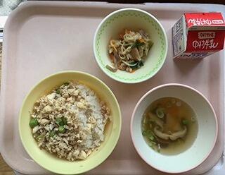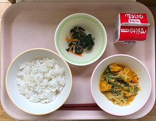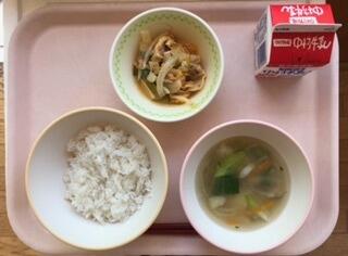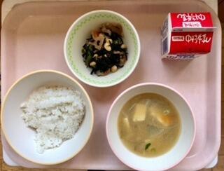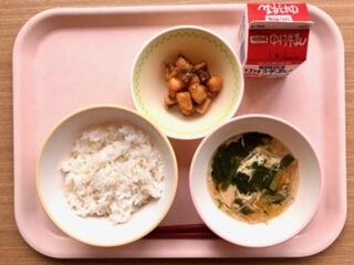 今日の給食は、ご飯、魚の煮物、和え物、汁物という「和食」です。平成25年に、「和食」がユネスコの無形文化遺産に登録されました。世界中が和食に注目しています。それは、日本では、季節や地域ごとに、新鮮な食材を生かした料理が昔から作られてきたことが魅力の一つです。みなさんは、春夏秋冬の四季があるのは、日本だけということを知っていましたか?季節の移り変わりがあることで、四季折々のいろいろな食材が収穫されます。また、昆布や煮干しからとっただしには「うまみ」がたっぷりでています。その「うまみ」を使って汁や煮物を作るため、おいしさが増して味付けに使う調味料が少なくて済みます。薄味でいつまでもあきのこない味に仕上がります。この「うまみ」は他の国にはない食文化です。日本特有の食文化を受け継いでいきたいですね。