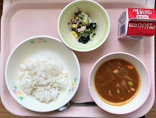今日のカレーは、じゃがいも、玉ねぎ、人参の他に、夏野菜のかぼちゃ、なす、枝豆やピーマンなどが沢山入った夏野菜カレーでした。今が旬の夏野菜は、地元で収穫されたものを届けていただき、使わせていただきました。夏に収穫される色の濃い野菜には、カロテンやビタミンCがたくさん含まれています。これらは、暑い夏も毎日元気に過ごせるように体を守ってくれますので、ぜひご家庭でも料理に活用しましょう。