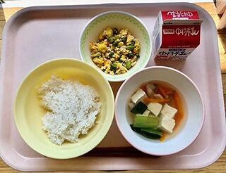 今日は、鶏そぼろ丼の具を麦ごはんにかけて食べてもらいました。お箸を正しく持つことを意識しながら、食器をもって上手に食べてくれたようです。子どもたちの大好きな味付けで、残さず食べてくれました。