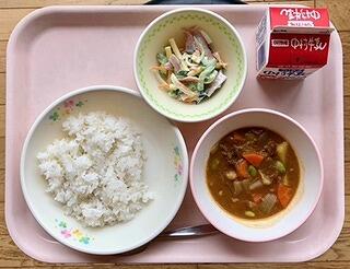 子どもたちに好きな献立を聞くと、必ずカレーライスが上がってきます。学校給食のカレーライスは、2種類のカレールーをまぜて作っています。さらに、コクやうまみを出すために、ウスターソースやトマトケチャップ、チーズパウダー、りんごのすりおろしなどを隠し味に入れています。その他に、季節の野菜やお肉も入れて具沢山に仕上げます。今日は豚肉を入れましたが、鶏肉や牛肉、ひき肉、時には五ヶ瀬町特産の特ホルが入ることもあります。