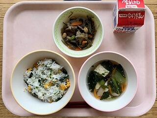 今日の菜の花ごはんには、残念ながら本物の菜の花は入っていません。卵の黄色とほうれん草の緑で春の菜の花をイメージしてみました。混ぜご飯の具にはちりめんやごまを混ぜてカルシウムたっぷりに仕上げました。