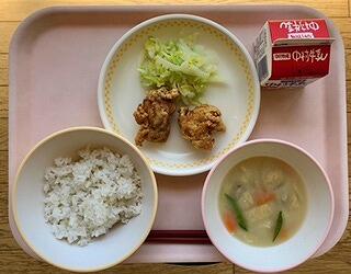 食事をする時には、食器の置き方が決まっています。給食でも同じように確認しながらお盆の上に皿を並べます。主食の麦ごはんは手前の左側、みそ汁は汁物なので手前の右側、からあげとキャベツの塩もみは奥の真ん中、牛乳は奥の右側、おはしは一番手前に並べます。子どもたちは、「いただきます」の前に間違えていないかしっかり確認してくれています。