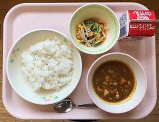 今日の給食は、県から提供していただいた、宮崎の地鶏ブランドである「みやざき地頭鶏」を使ったカレーでした。普通の地鶏が80日間ほど飼育されるのに対して、「みやざき地頭鶏」は120~150日間という長い期間、ストレスのない環境での中で手間と愛情を注いで育てられているそうです。広々とした地面を自由に走り回れるので身が引き締まって、脂肪が少なく、歯ごたえがあって、うまみたっぷりのジューシーな肉汁が出るのが特徴です。よく噛んで味わっていただきました。