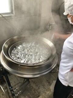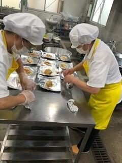 今日の給食は魚のホイル蒸しでした。中に入れる野菜は、別に炒めて味付けをし、下味をつけた魚の上にのせ、最後にチーズをかけた物を一つ一つホイルで包みました。大きな釜で湯を沸かし、専用のザルの上に並べて蒸し焼きにして仕上げました。味付けも良く、魚も柔らかく蒸し上がっていたので、子どもたちに好評でした。