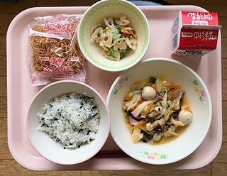 今日は久しぶりに皿うどんの登場でした。1年生にとっては、給食で初めて登場する皿うどんでしたので、パリパリ麺をお皿に移すのに苦戦していました。細かくなった麺と具材をからませながら、箸を上手に使って食べるのも難しかったようで、完食までにいつも以上に時間がかかっていました。一方、他の学年は、慣れた手つきでお皿に麺を移し、上手に時間内に食べ終わっていました。1年生も少しずつ慣れて、上手に食べられるといいですね。