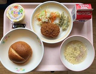 子どもたちの大好きなセルフバーガーの給食でした。パンにコロッケ、ゆで野菜、ソースをはさんでコロッケバーガーにして食べてもらいました。1年生も上手にハンバーガーが作れたようで、両手で持って上手に食べていました。