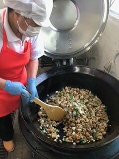 さて、今日は宮崎捕れのフカを使用したケチャップ炒めでした。写真は、実際に調理している様子です。大きな釜に野菜や揚げた魚を入れ、炒めているところです。ピーマンや大豆に苦戦している子どもたちもいましたが、最後までがんばって食べていました。