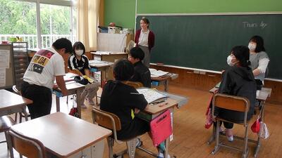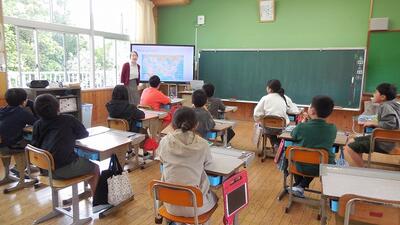 ALTの先生との授業。先生の来校を楽しみにしています。子どもたちはよりいっそう笑顔で、表現は豊かに、そしてコミュニケーションが活発になります。