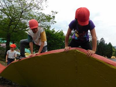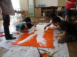 最後に筆や刷毛をもち、みんなで色を塗りました。完成した団看板は、運動会で披露します!