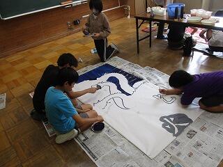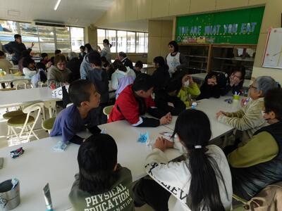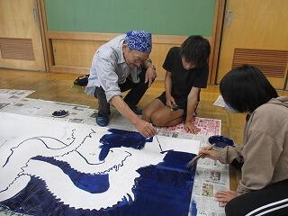 調理の合間に、1~4年生と5・6年生が交代で絵画作品づくりに取り組みました。講師は、絵画で有名な地域の先生です。