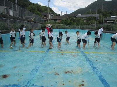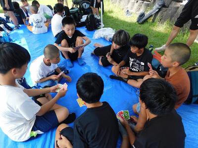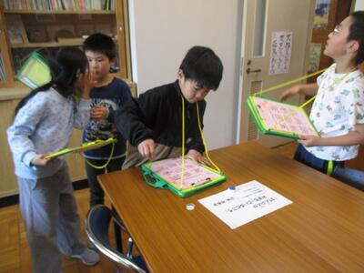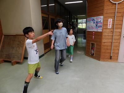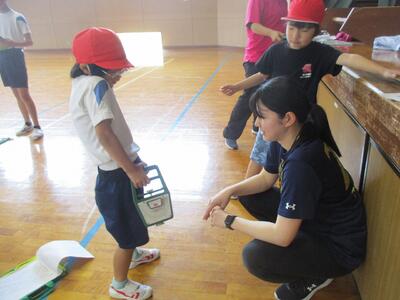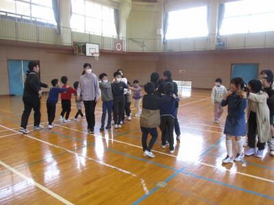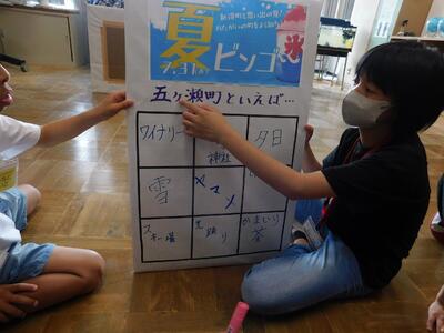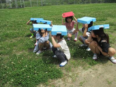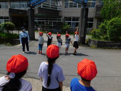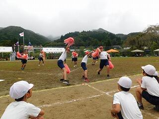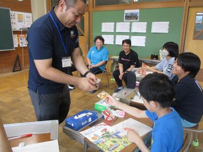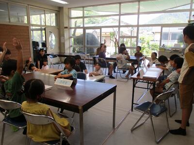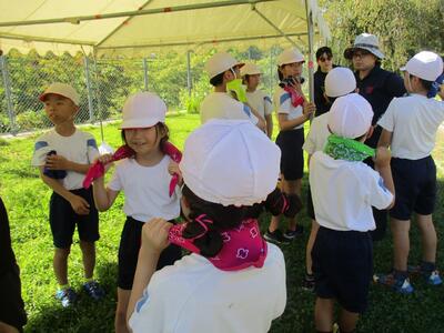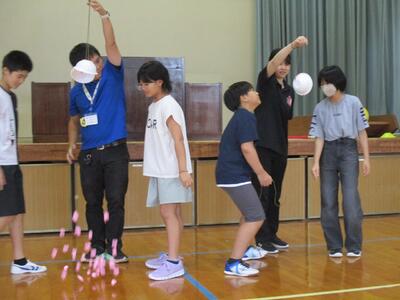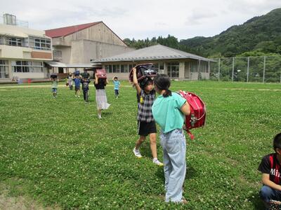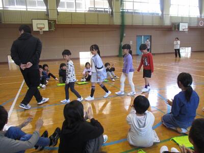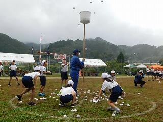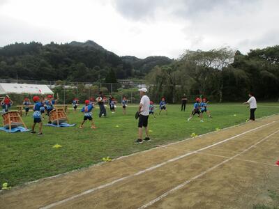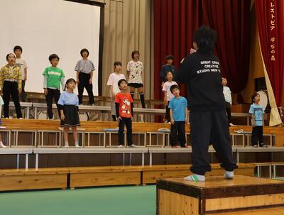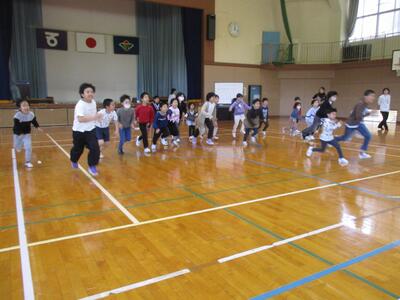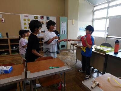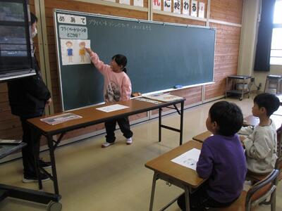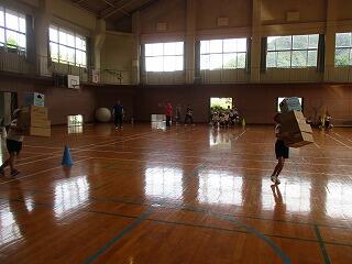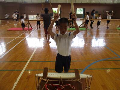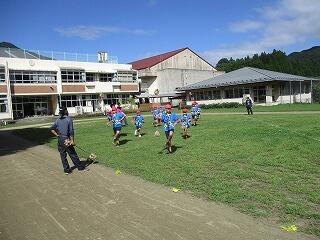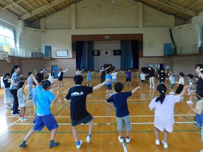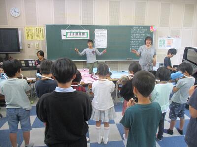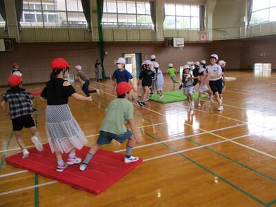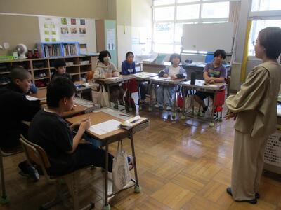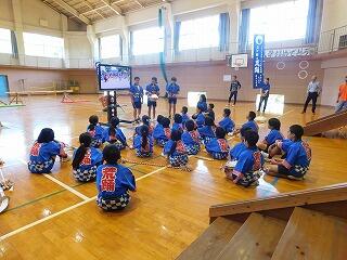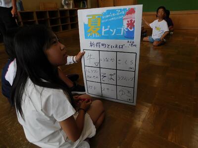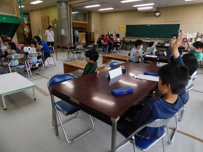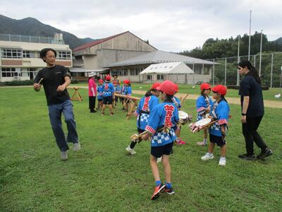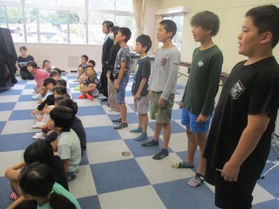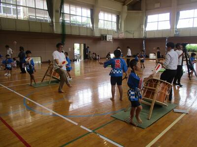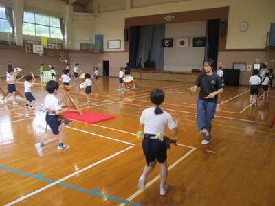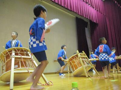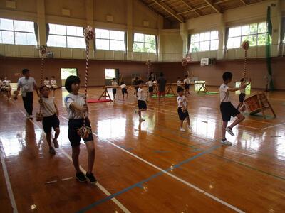 9月28日(日)は、荒踊奉納の日です。最後の練習は、実際に法被をまとって運動場で行いました。いつものように保存会から指導者の方々が来てくださり、熱心にご指導くださいました。練習の後は、指導者の方やその他の学習で指導してくださっている地域の先生方と一緒に給食を食べました。給食の後は、きらきら(縦割り)班ごとに先生方とゲームやクイズをして楽しんでいました。