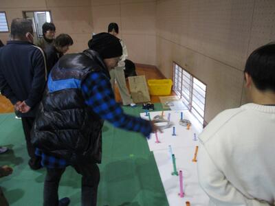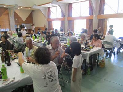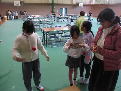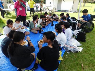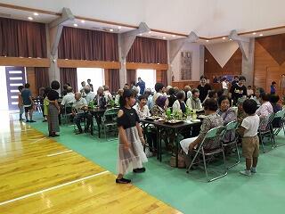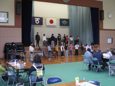 体育館では、子どもたちが音楽の発表をしたり、みんなで会食をしたりしました。