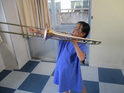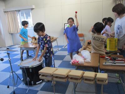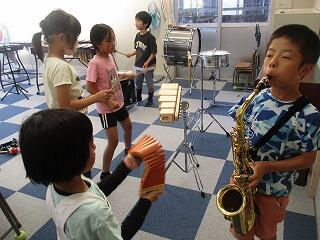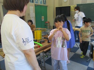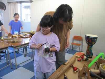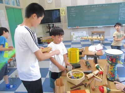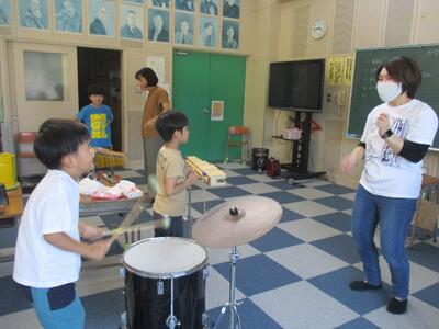 G音楽隊さんが、放課後子ども教室にたくさんの楽器を持ってきてくださいました。これまでも何度もいろんな楽器に触れる体験をさせてくださっています。子どもたちは、思い思いに楽器に触り、リズムに乗って楽しんでいました。