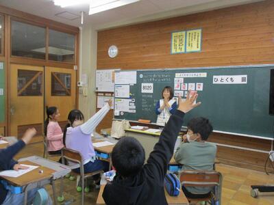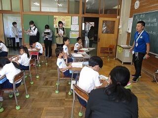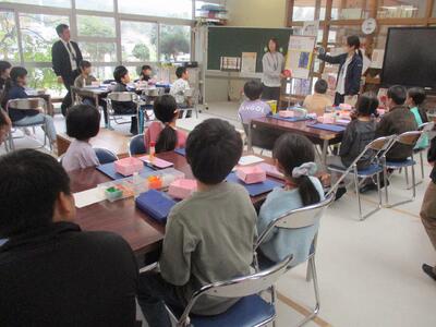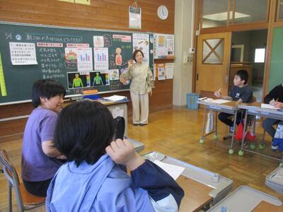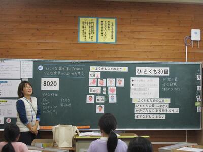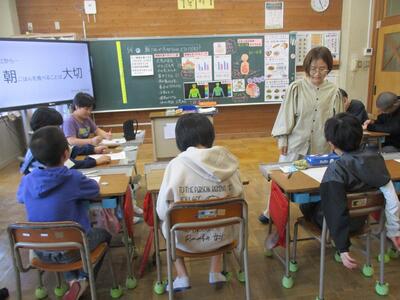 1・2年生の食の学習に、他校の栄養教諭に来ていただきました。食事のマナーや箸の使い方を教わった1・2年生、早速給食の時間に意識してマナーよく食べることができました。
