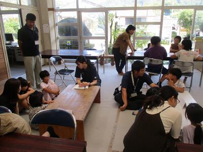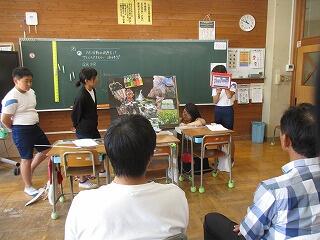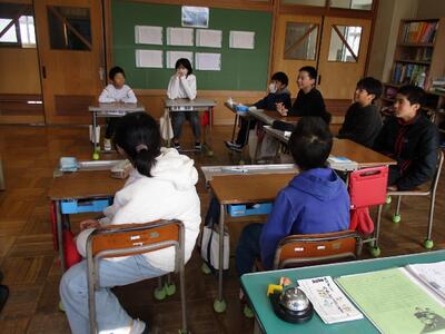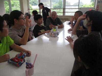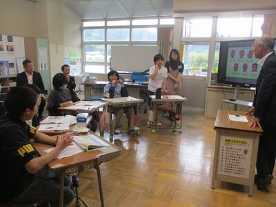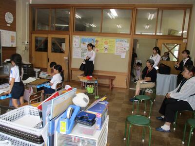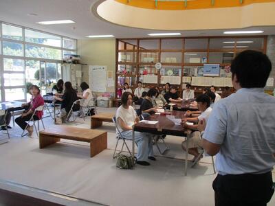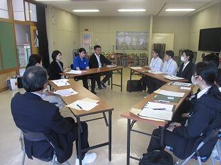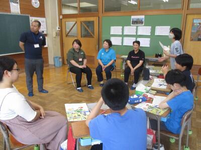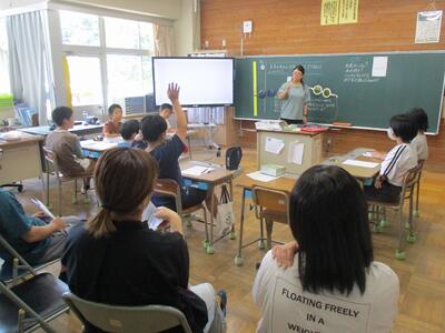 子どもたちが下校した後は、大学生から五ヶ瀬町の学校、坂本小の取組や複式の授業などについての質問を受けました。未来の教師の皆さんは、興味深く本校の先生たちの話を聞いていました。