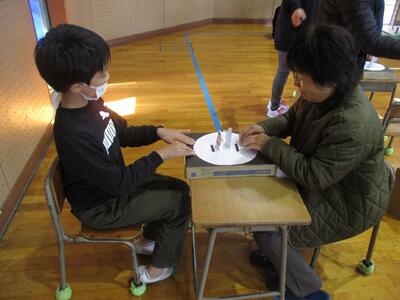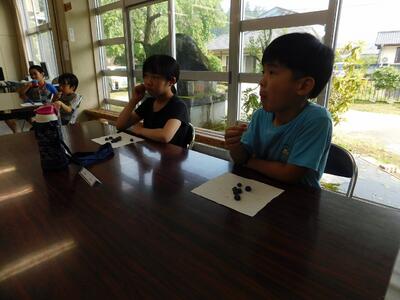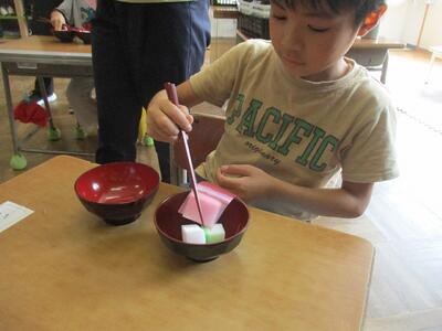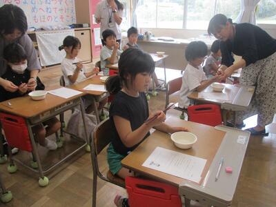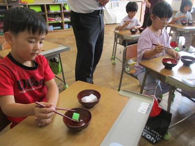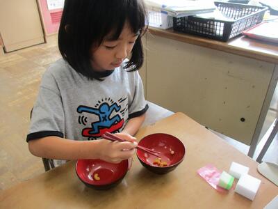 最後は、マカロニと大豆。やや苦戦しながらも、みんな上手に箸を使っていました。