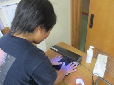 手洗いの後にチェッカーで確認。指の付け根にまだ汚れが?!