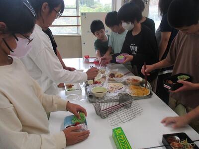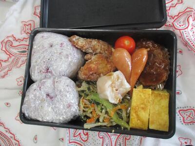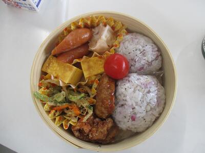 10月22日の弁当の日は、家から持ってきた弁当箱に給食のおかずを詰めるという活動をしました。おにぎりは自分で握り、おかず(卵焼き、ウインナー、ハンバーグ、から揚げ、シュウマイ、ミニトマト、小松菜のごま和え)を思い思いに弁当箱に詰めていきました。どの子もおいしそうな弁当にしていました。