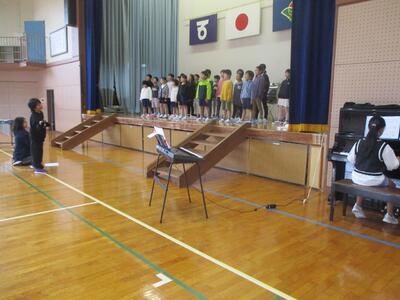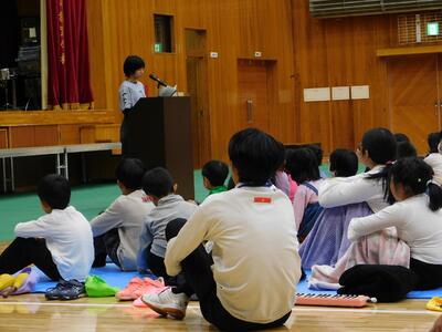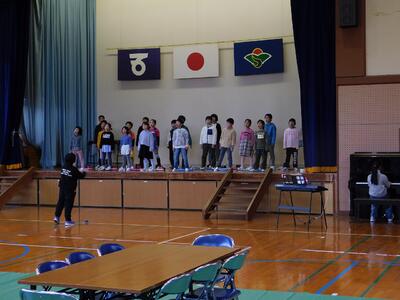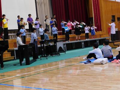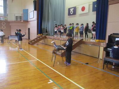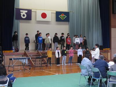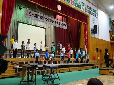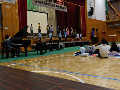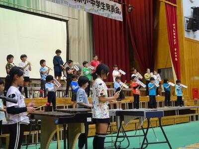 10月29日(火)、五ヶ瀬中等教育学校の体育館に町内の小中学生が集まり、意見発表や合唱・合奏の発表をしました。坂本小児童は、合唱「ぼくらの日々」合奏「ミッキーマウスマーチ」を発表しました。これまで一生懸命に練習を重ねてきた成果を発揮すべく、子どもたちは堂々と自信をもって発表していました。合唱は、本当に27名しかいないの?と思うくらい大きな歌声が会場に響き渡りました。合奏は、学年に応じたそれぞれの楽器を手に、指揮に合わせて、きれいに音を重ねていました。