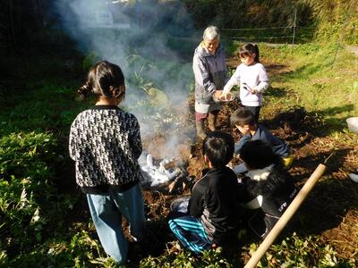 まずは、畑で焼きいもです。新聞紙とアルミホイルで包んだいもを火に入れました。