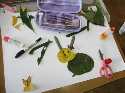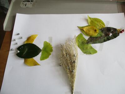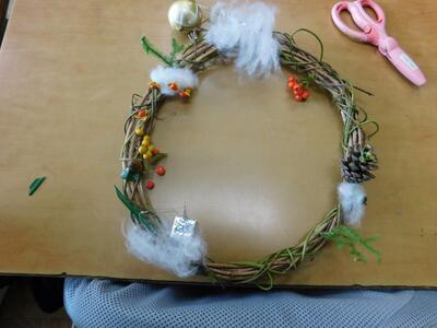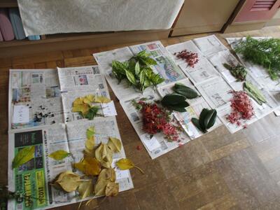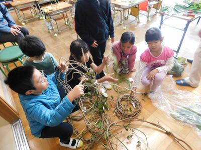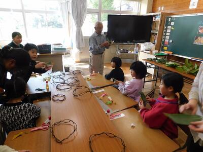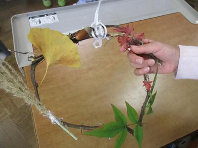 いもを焼いていただいている間に、リース作りをしました。地域の先生がたくさんの材料(秋の自然)を持ってきてくださいました。