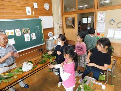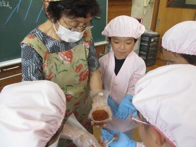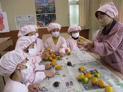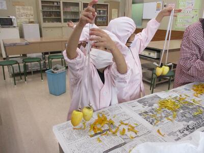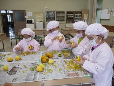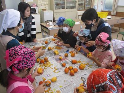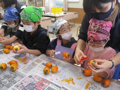 1・2年生が、生活科の学習で干し柿づくりをしました。渋柿は、地域のお寺で採らせていただいたものです。そして今回も、梅干し・梅ジュースづくりのとき同様、地域の先生からご指導をいただきました。慣れない道具も使いながらの活動でしたが、丁寧なご指導のおかげで、子どもたちは上手に安全に活動を楽しんでいました。食材をおいしくいただくための先人の知恵を体験し学んだ子どもたちでした。