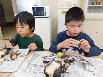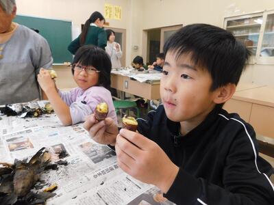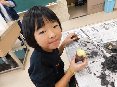 地域の先生方が、1・2年生の生活科で焼きいもとリース作りをしてくださいました。いもは、1・2年生が育て、先日掘ったいもです。