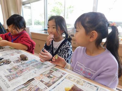 地域の先生が、1・2年生の生活科学習のために「秋のしぜん」を持ってきてくださいました。子どもたちは、材料を見て想像を膨らませながら、思い思いに、そして楽しそうに作品を作っていました。この日は、収穫したサツマイモを焼き芋にしてもらって食べた子どもたち。大満足の午前中でした。