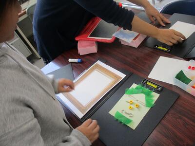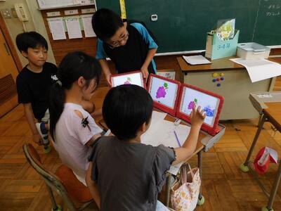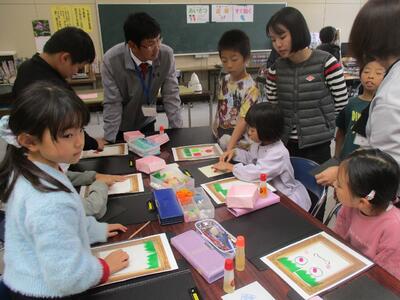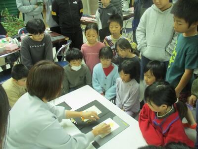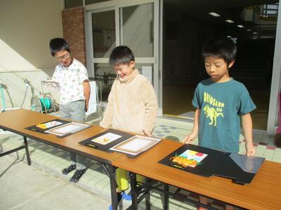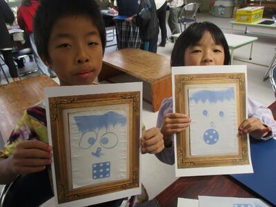 県立美術館からお二人の先生が来られて、美術の授業をしてくださいました。まずは宮崎県出身の画家 瑛九氏とその作品について教えてくださいました。そのあと瑛九氏が発案された「フォトデッサン」を子どもたちにも体験させてくださいました。特殊な用紙に光を当て、その影で人の顔を作るという活動でした。単に絵を描く、工作する、とは少し違った作品作りに触れ、子どもたちはさらに芸術の世界への関心を高めていました。