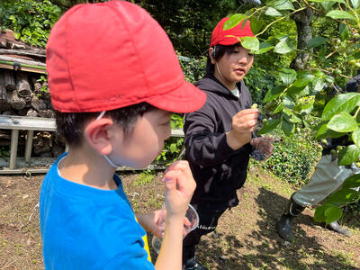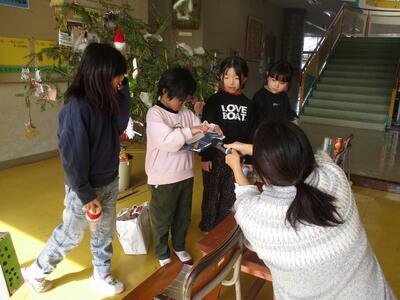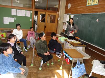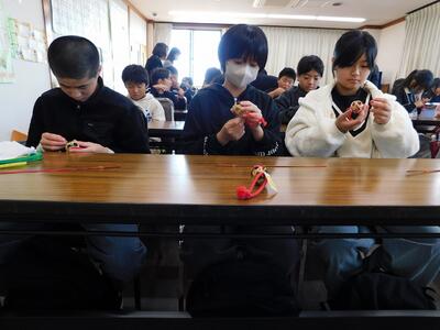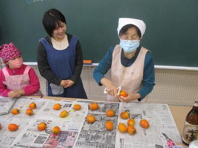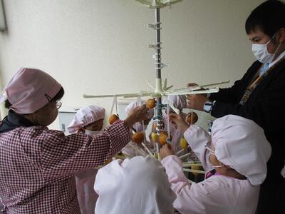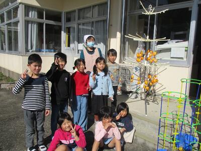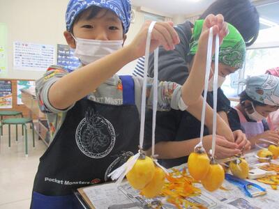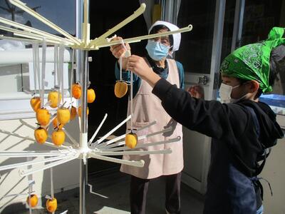今年も、1・2年生が地域の先生から干し柿の作り方を教えていただきました。渋柿の皮をむいたり紐をつけたりして、興味津々で取り組みました。最後に柿を干して「早く甘くなりますように」と願っていました。
