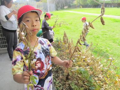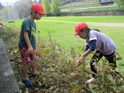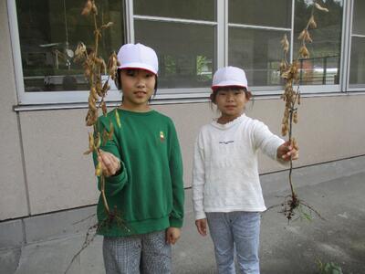 3・4年生が大豆の収穫をしました。今年も町教育委員会からいただいた種からたくさんの大豆を収穫することができました。収穫した大豆は、このあと日融工房さんで給食用の味噌にしていただいたり学校で給食の材料にしてもらったりします。坂本小でできた大豆を食べる日が楽しみです。