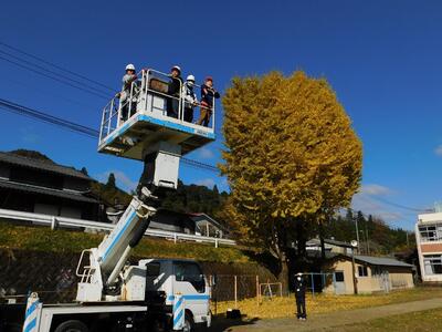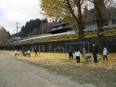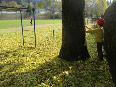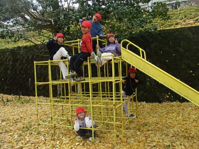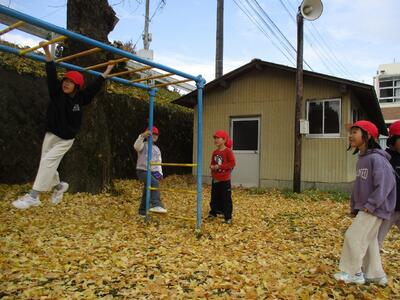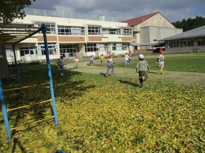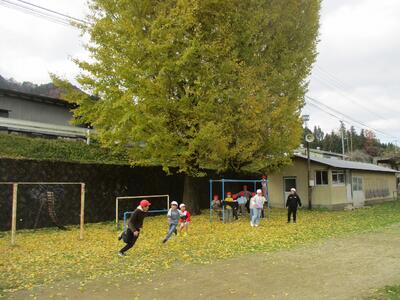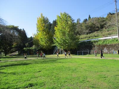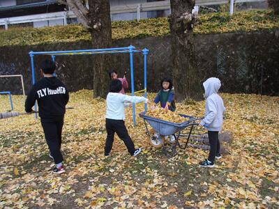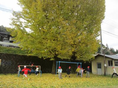 坂本小の運動場には4本のイチョウの木があります。今年も11月に入る頃から色づき始め、11月の終わり頃に葉が落ち始めました。風にあおられ、たくさんの黄色の葉が舞い散ると、子どもたちが両手を広げて葉を受け止めるかのようなしぐさをします。そして黄色い絨毯の上で遊んだり走ったりします。イチョウの木は、坂本小の子どもたちを見守ってくれているかのようです。