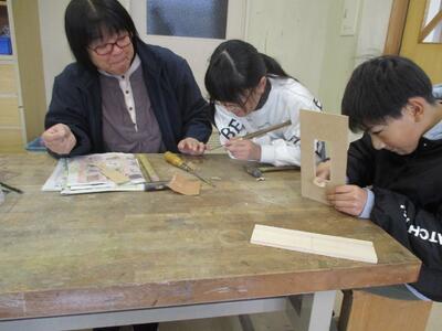 5・6年生は、図工の作品作りをしていました。一枚の板を材料に、糸のこや工具を使って熱心に活動していました。