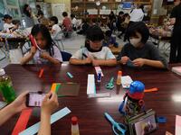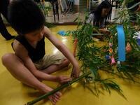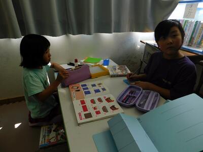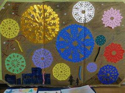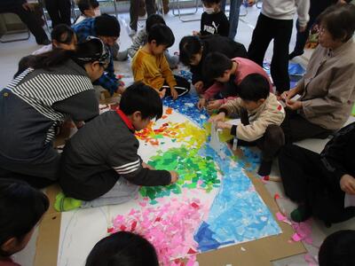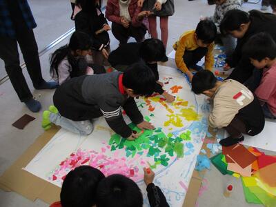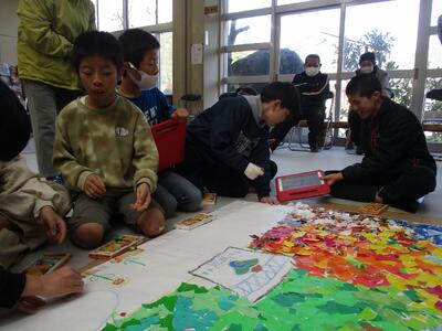 まずは、1~4年生が、先生が描いてくださった下絵に色紙を切り貼りしていきました。